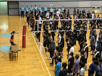大洲市PTA連合会主催のレクバレー大会が行われました。開会式の後、6チームずつ3つのゾーンに分かれてリーグ戦を行いました。
