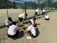練習前に部員全員で除草作業に取り組みます。夏は雑草が元気に生えます。部活前にみんなで協力し、コートを整えます。